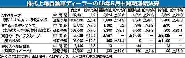 上場ディーラー4社08年9月中間期連結、増収はATグループ、静岡スバル2社のみ