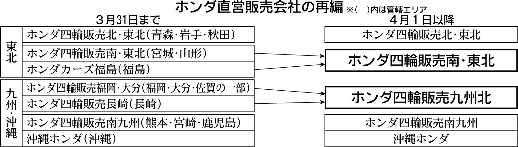 ホンダは4月1日付で東北の直営販社2社を合併する。宮城県と山形県にまたがる広域販社のホンダ四輪販売南・東北(漆間栄社長、仙台市宮城野区)と、ホンダカーズ福島(渡辺広章社長、福島県郡山市)を合併する。同日付で、九州・沖縄地区でも直営販社が2...