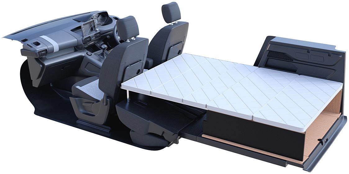 ベッドサイズは長さ1800ミリメートル、幅1200ミリメートルで、大人2人分のサイズを確保した。ベッドマットは5分割構造でラゲッジスペースに収納可能で、走行時は5人乗車のスペースを確保した。表皮素材は防汚・対候性に優れたPVCレザーを採用。表皮、サイド部の色の組み合わせを22通りのバリエーションから選択できる。
