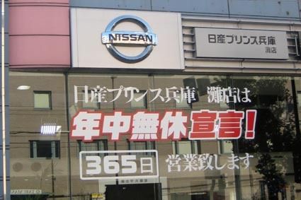 ○…新車ディーラーが年中無休宣言。これは日産プリンス兵庫(長手淳社長、神戸市灘区)でのひとコマ。同社は数年前から灘店(同)のみ365日営業体制を敷いているが、このほど改めて顧客に周知する意味で、店頭へ大きく掲揚した。近畿地区の新車ディーラ...