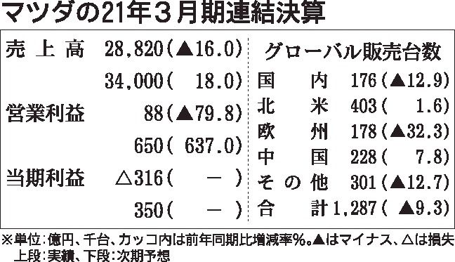 21年3月期の業績は、出荷台数が20年3月期と比べて24万台以上減少した影響などが1085億円の減益要因となった一方、諸経費や研究開発費の効率化といった固定費の削減効果で763億円の増益要因を捻出。損益分岐台数を20年3月期と比べて12万1千台引き下げた。7月に出した当初の通期見通しでは400億円の営業赤字予想だったが、上方修正を繰り返し、最終的には88億円の営業黒字を確保した。丸本明社長は「すべての領域が危機感を共有し、構造改革挙げて取り組んだ」と総括した。