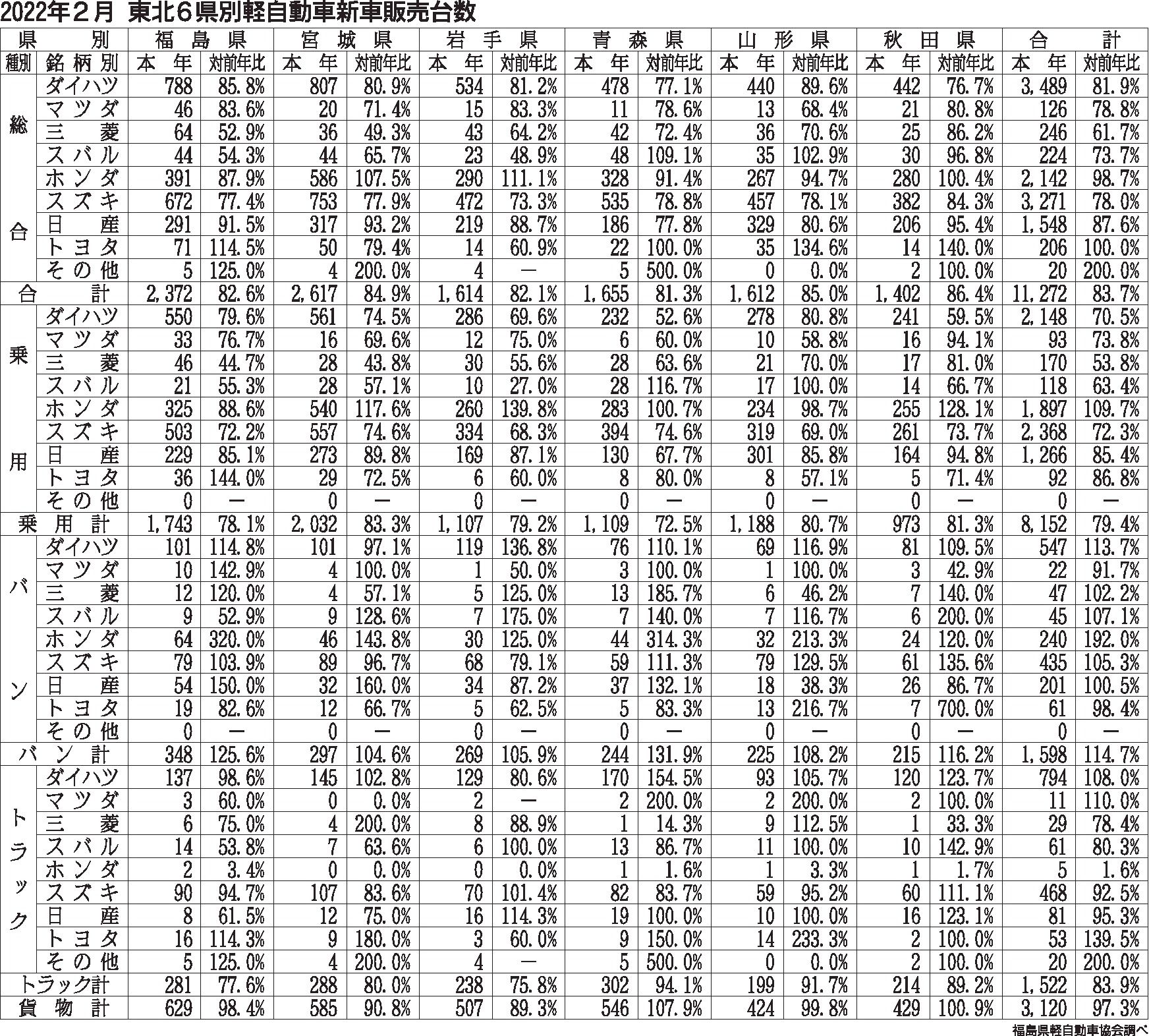 〈2022年2月 東北6県別軽自動車新車販売台数〉
