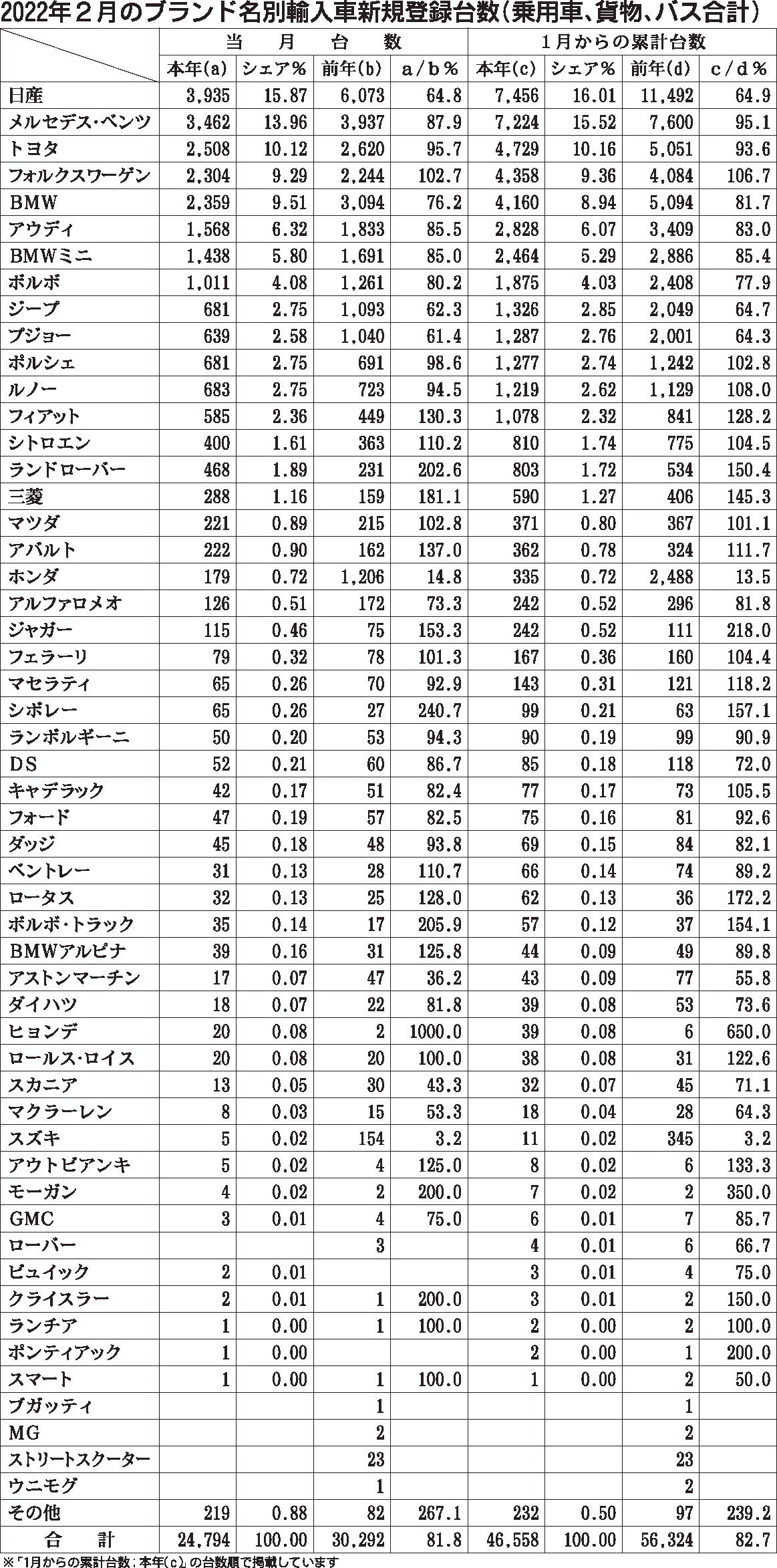 〈2022年2月のブランド名別輸入車新規登録台数(乗用車、貨物、バス合計)〉