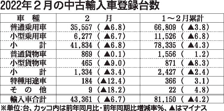 日本自動車輸入組合(JAIA、クリスチャン・ヴィードマン理事長)が10日発表した2月の輸入中古車登録台数は、前年同月比6・7%減の4万3361台となった。外国メーカー車の新車供給量が減少したことで納期遅れが発生。これにより、下取り車が減っ...