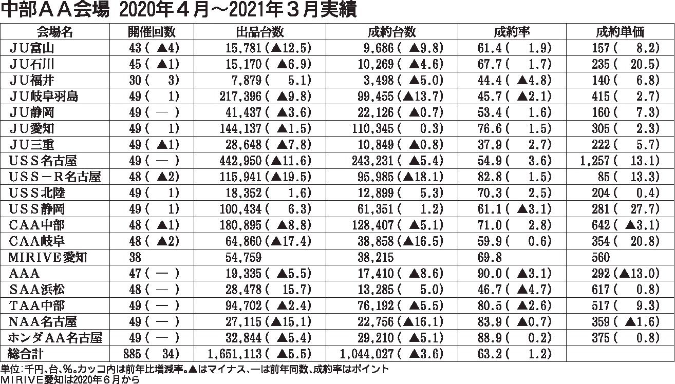 日刊自動車新聞社は、中部地区の中古車オークション(AA)19会場の2020年度(20年4月~21年3月)実績(主催者発表、速報値)をまとめた。20年6月に新会場「ミライブ愛知」が加わり開催回数が前年比34回増の885回となったものの、20...
