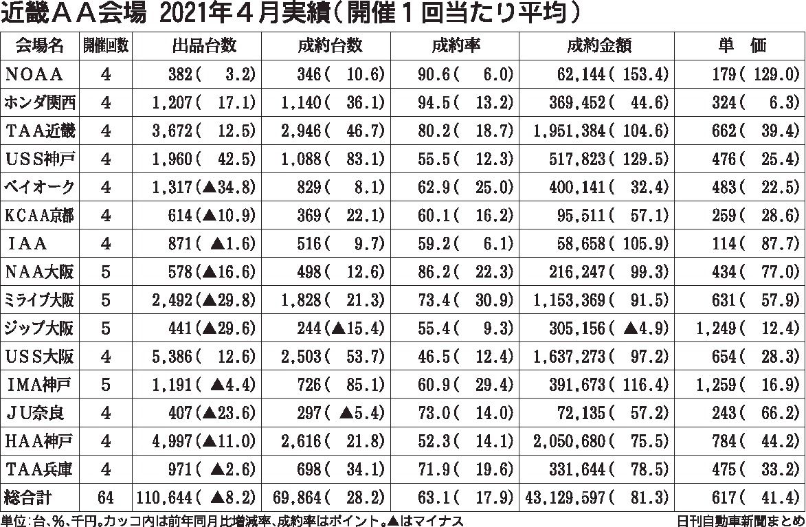 近畿地区にある中古車オークション(AA)15会場の4月実績がまとまった。開催数は全64回で、前年同月に比べ3回減だった。出品台数は8・2%減の11万644台だったが、成約関係は全項目で大幅増を果たした。昨年4月は新型コロナウイルスの感染拡...
