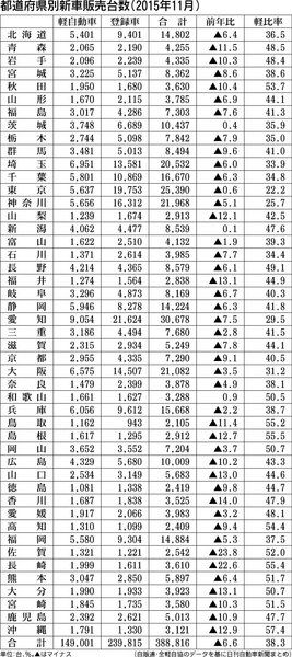 日刊自動車新聞は2015年11月の都道府県別新車販売台数および軽自動車比率をまとめた。販売台数は44都道府県で減少しており、増加したのは和歌山、茨城、新潟の3県だけだった。軽比率が最も高かったのは沖縄で57・4%だった。 11月の全国市場...