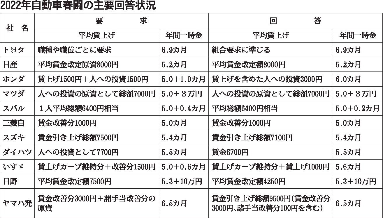 2022年の春季労使交渉(春闘)が16日、自動車メーカーの一斉回答日を迎えた。一斉回答日を待たずして満額回答の意思を示したトヨタ自動車など大手3社のほか、三菱自動車やマツダなど3社が賃上げ、一時金ともに満額で回答した。業績が回復傾向にある...