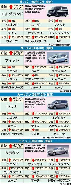 ガリバー自動車研究所、カーチス、カーセブンディベロプメント、ラビットが調べた2008年10月の中古車査定・買い取りランキングでは、ミニバン、コンパクトカー、軽自動車など各カテゴリーの車種構成に大きな変動はなかったものの、新型車への代替にと...