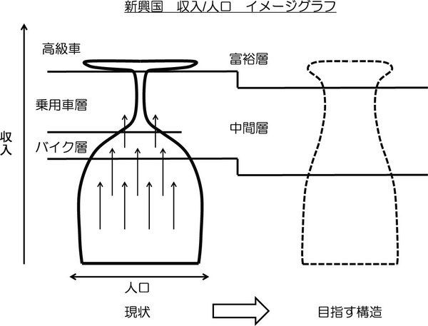 今後、日本の自動車産業が世界で伸びていくためには、市場が飽和している先進国より、やはり新興国がキーになってくると思います。新興国では車を買えるユーザー層の増加、低価格車等がポイントになります。 その国の経済発展の効果が富裕層にだけでなく、...