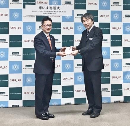 あいおいニッセイ同和損害保険札幌支店(古澤秀彦支店長)はこのほど、札幌市に車いす1台を寄贈した。札幌市保健衛生局で開かれた寄贈式で、古澤支店長が館石宗隆保健衛生局医務監に目録を手渡した。 同社は社会貢献活動で募金制度「ゆにぞんスマイルクラ...