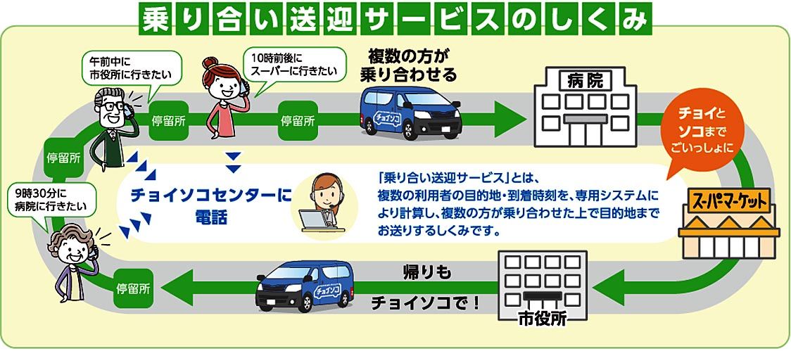 アイシンは、地域の交通不便を解消し、主に高齢者の外出を促進するオンデマンド型乗り合い送迎サービス「チョイソコ」を2018年にスタートした。会員登録された利用者から電話やインターネットで予約を受け付け、カーナビゲーションで培った技術を生かし、最適な乗り合わせ順と経路を割り出して目的地まで送迎する=図。