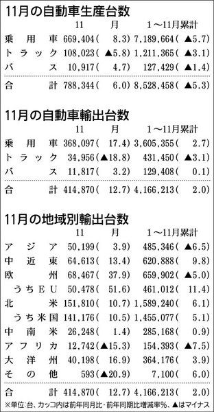 日本自動車工業会が12月28日に発表した11月の国内生産実績によると、四輪車生産は前年同月比6・0%増の78万8344台と、17カ月ぶりに前年を上回った。消費増税後に落ち込んでいた登録車の国内販売が回復基調にあるのに加え、海外で生産してい...