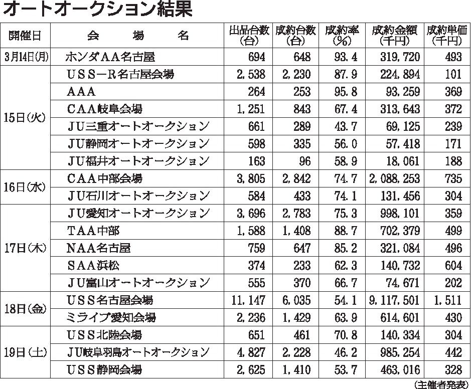 〈オートオークション結果〉中部地区 2022/3/14~19