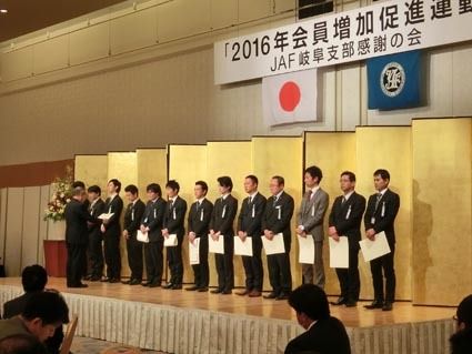 【岐阜】日本自動車連盟(JAF)岐阜支部(甲谷弘支部長)は9日、岐阜市内のホテルで「2016年会員増加促進運動JAF岐阜支部感謝の会」を開催した。会員獲得において優秀な成績を残した販売会社や拠点、営業スタッフを表彰した。 甲谷支部長は「在...