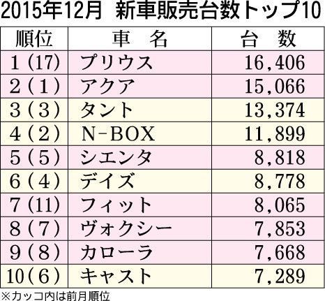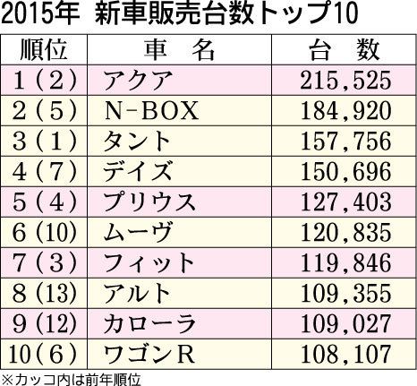 2015年の新車販売の車名別順位で、トヨタ「アクア」が2年ぶりに首位に返り咲いた。アクアの販売実績は前年比7・6%減の21万5525台。軽の有力車種や登録のライバル車が軒並み10%以上の落ち込みを見せるなかで、販売規模を維持した。2位はホ...