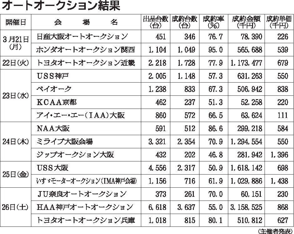 〈オートオークション結果〉近畿地区 2022/3/21~26