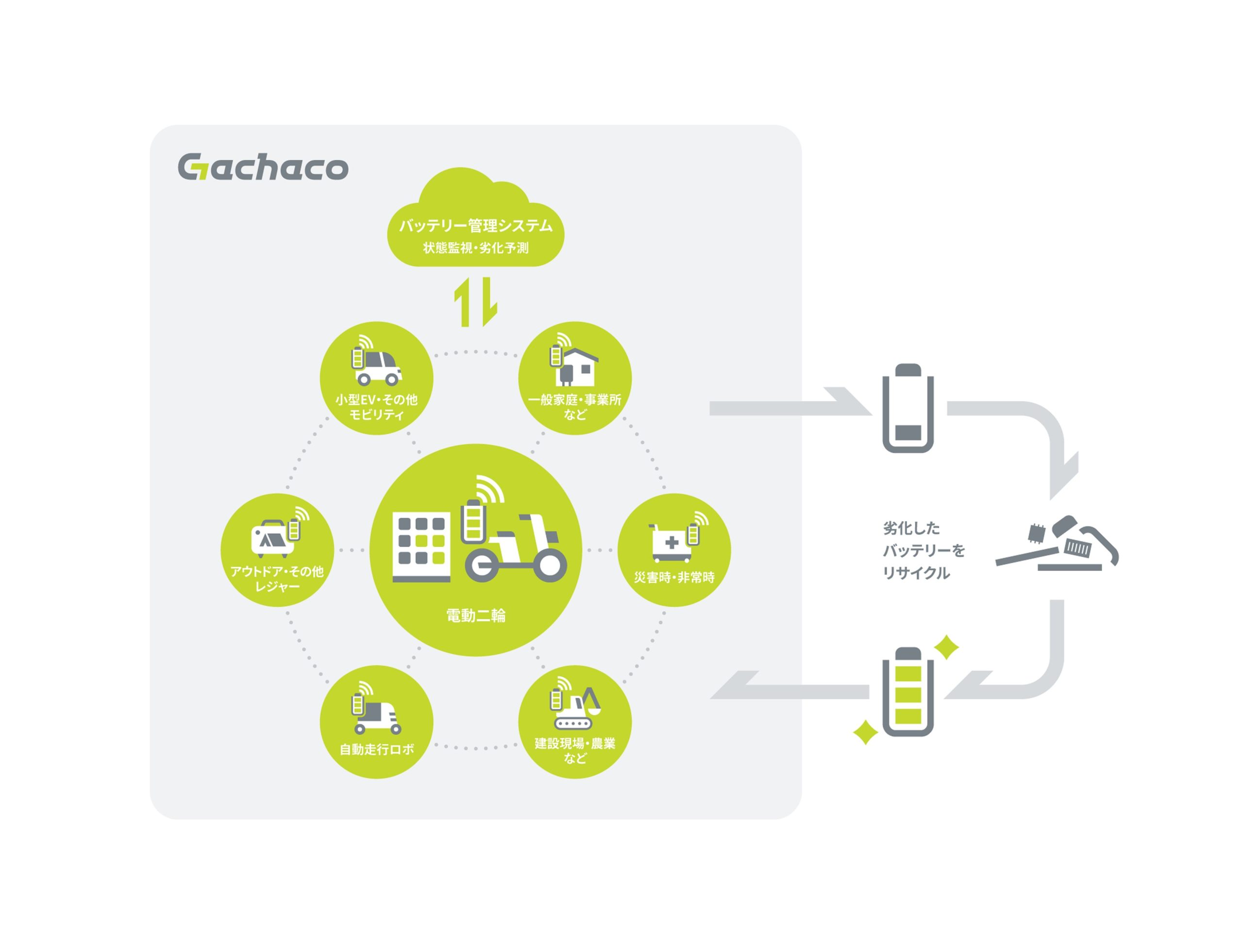 ガチャコは二輪車メーカー4社による共通規格に準拠したホンダの交換式バッテリーのシェアリングサービスを提供する。現時点で商品化済みの電動二輪車がホンダのビジネス用バイクに限定されていることもあり、まず法人向けの需要を想定する。ステーションはエネオスのガソリンスタンドや駅前、コンビニなどの需要が見込めるポイントへの設置を検討する。設置基数は検討中だが、22年度に200台の二輪車をまかなえるように設置した後、23年度内に1000台分まで設置数を拡大する方針。
