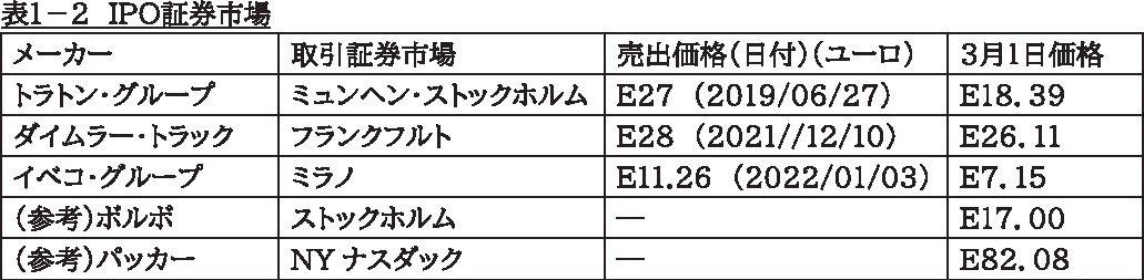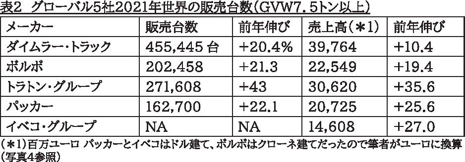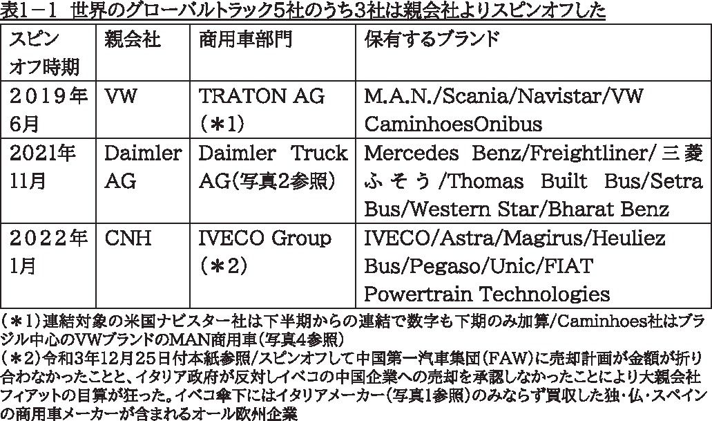 商用車グローバル5社 (市場動向等は3月12日付本紙参照)なお経営結果の数字は全て各社決算書より引用したもので、販売の数字等は各国の公式登録統計と異なることあるのをご承知ください。 (1)グローバル5社のうち3社が分社化し全てが商用車メー...