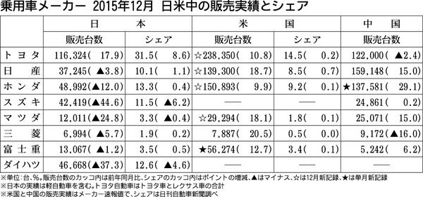 【乗用車メーカー 2015年12月 日米中の販売実績とシェア】