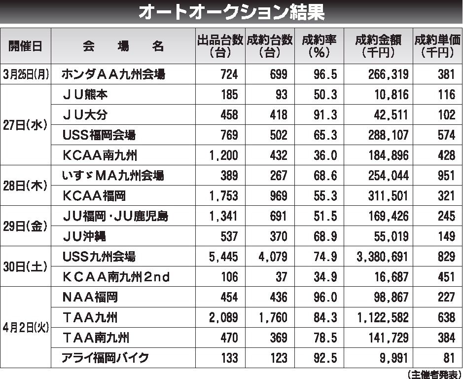 〈オートオークション結果〉九州地区 2024/3/25~4/2