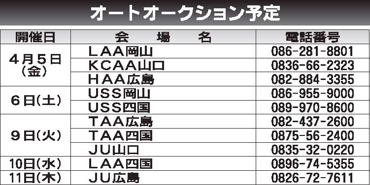 〈オートオークション予定〉中国・四国地区 2024/4/5~11