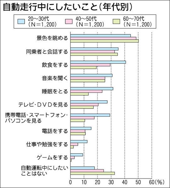 自動運転中は景色を眺める―。損害保険ジャパン日本興亜は10日、自動運転車に関する意識調査アンケートの結果を公表した。春の全国交通安全運動における「交通事故死ゼロを目指す日」に合わせて実施したもので、自動運転車の社会受容性や法的責任などに関...