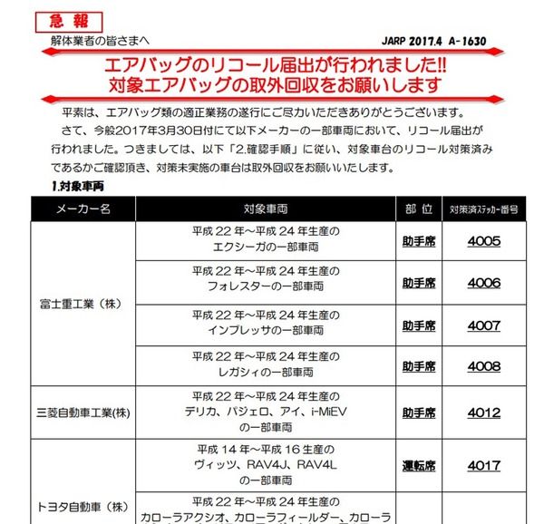 エアバッグのリコール対象車種の増加に伴い、使用済み自動車のエアバッグ取り外し回収業務で、リサイクル事業者の作業負担が増えている。通常であれば、車上作動処理で回収処理できるが、リコール未対策の場合には、取り外し回収のために通常より多くの時間...