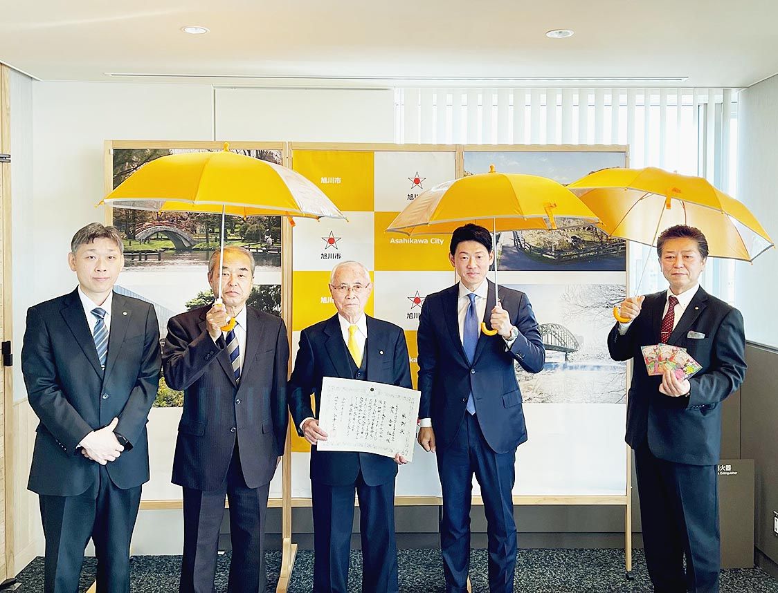 【旭川】旭川地方自家用自動車協会( 吉※田裕会長)は、2024年の小学校新入学児童用として旭川市に反射材付き学童傘1500本、深川市に同120本などを寄贈した。 旭川市では、 吉※ 田会長と今津寛介旭川市長が報道陣に傘をさしてピーアール=...