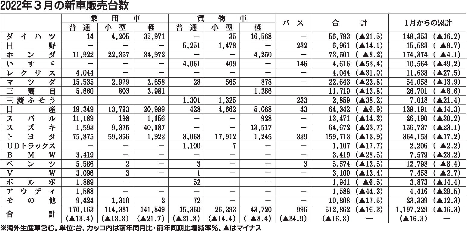 〈2022年3月の新車販売台数(メーカー別)〉