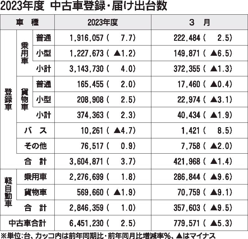 日本自動車販売協会連合会(自販連、加藤敏彦会長)と全国軽自動車協会連合会(全軽自協、赤間俊一会長)が10日発表した2023年度の登録車と軽の中古車登録・届け出台数は、前年比2.5%増の645万1230台だった。新車の供給制約が緩和したことで中古車の流通量も回復し、5年ぶりに前年を超えた。ただ、3月実績をみると、11カ月ぶりに前年を割り込んだ。年間でも市場規模が大きい同月の動きに、中古車関連の事業者からは今後の先行きを心配する声も出ている。