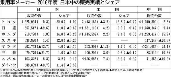 日刊自動車新聞がまとめた乗用車メーカーの2016年度米中販売台数は、米国で4社が、中国で5社が前年度実績を上回った。米では日産自動車、ホンダ、スバルが、中国ではトヨタ自動車、日産、ホンダ、マツダがそれぞれ過去最高だった。高水準の需要を背景...