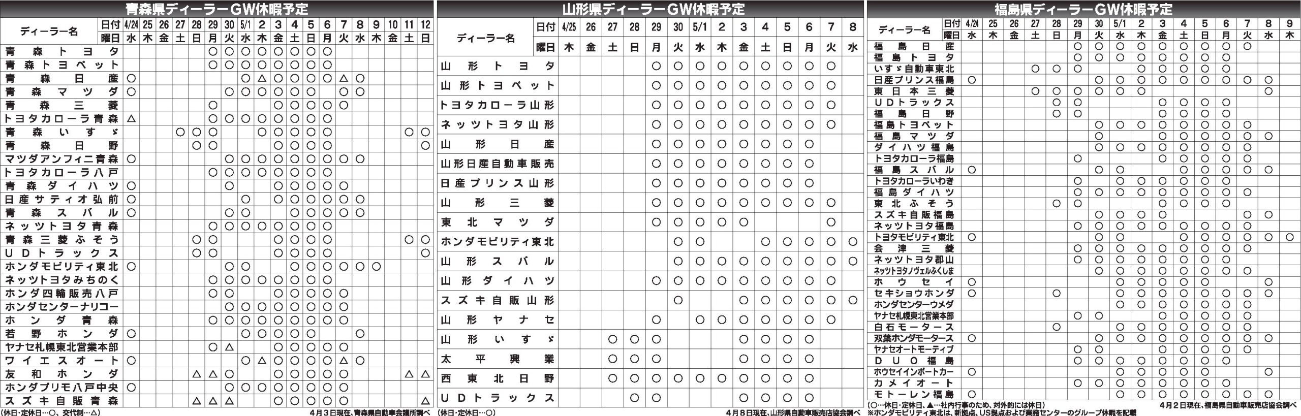 〈青森県・山形県・福島県ディーラーGW休暇予定〉