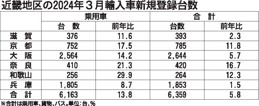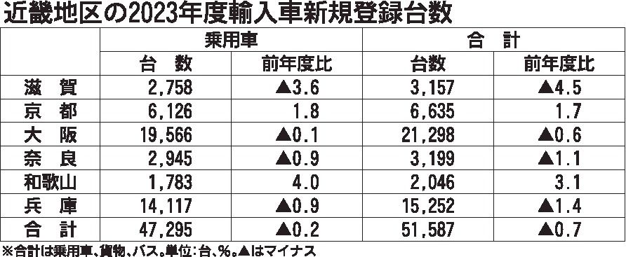 日本自動車輸入組合(JAIA)の発表によると、2023年度(4月~24年3月)の近畿地区の輸入車新規登録台数(外国メーカー車と日本メーカー車)は、前年度比0・7%減の5万1587台と2年連続で減少した。上期はプラス基調で推移したが、下期に...