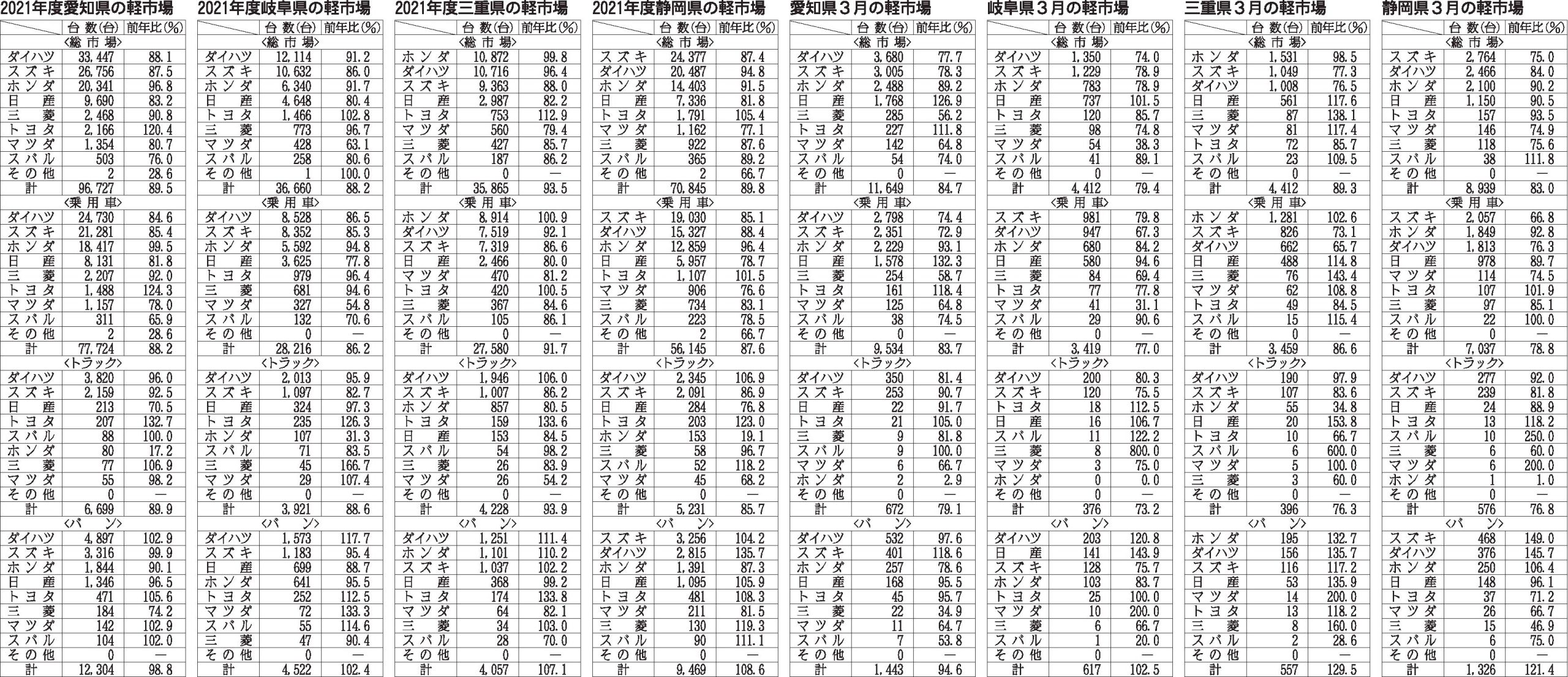 〈中部4県 2021年度/2022年3月の軽市場〉愛知県/岐阜県/三重県/静岡県