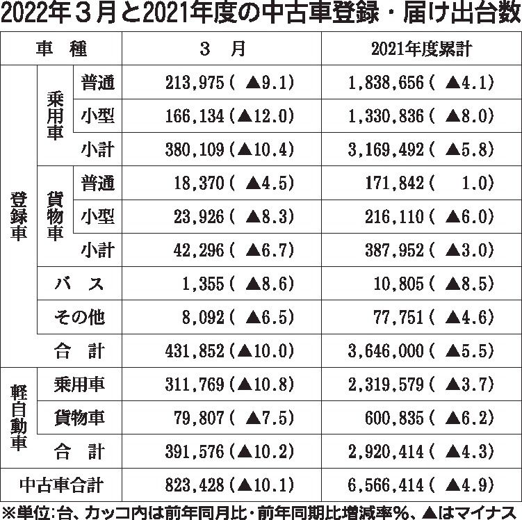日本自動車販売協会連合会(自販連、金子直幹会長)と全国軽自動車協会連合会(全軽自協、赤間俊一会長)が12日発表した2021年度の中古車登録・届け出台数は、前年度比4・9%減の656万6414台と前年実績を下回った。半導体不足により完成車メ...