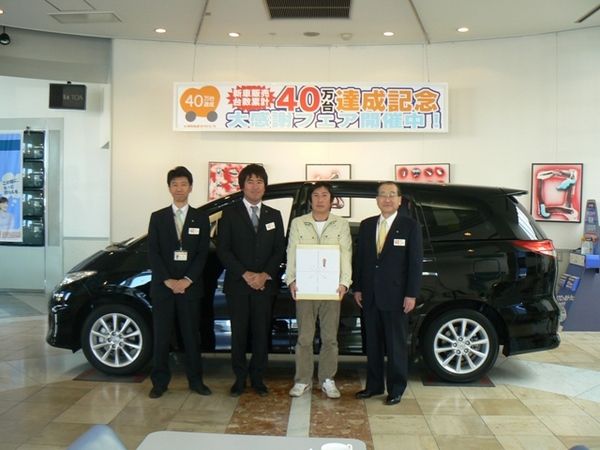 トヨタ西東京カローラ(山岸勝彦社長)は、本社桜ケ丘店ショールーム内特設会場グランプラスに山岸社長以下役員、販売担当者が出席して20日、新車販売台数累計40万台目の記念品贈呈式を行った。当日は40万台目の購入者、稲城市在住の角田浩二さんに山...