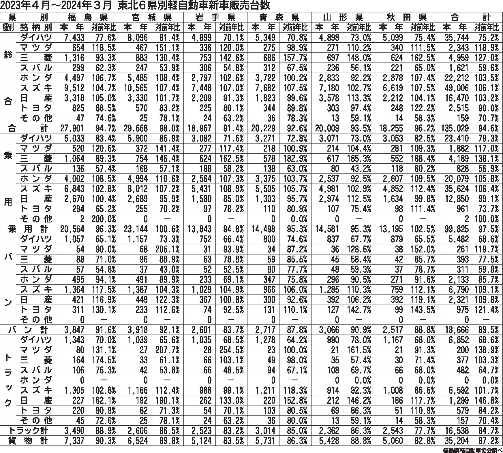 〈2023年4月~2024年3月 東北6県別軽自動車新車販売台数〉
