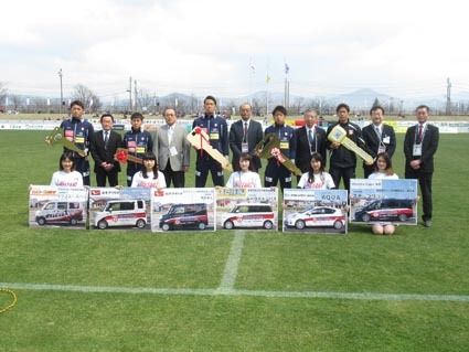 【盛岡】トヨタカローラ岩手(塚原安雅社長)、岩手ダイハツ(中田利光社長)、浅井自動車販売(浅井智則社長)、トヨタレンタリース岩手(元持雅行社長)、ホンダ四輪販売北・東北(赤羽根誠社長)の5社は16日、盛岡市のいわぎんスタジアムで「オフィシ...