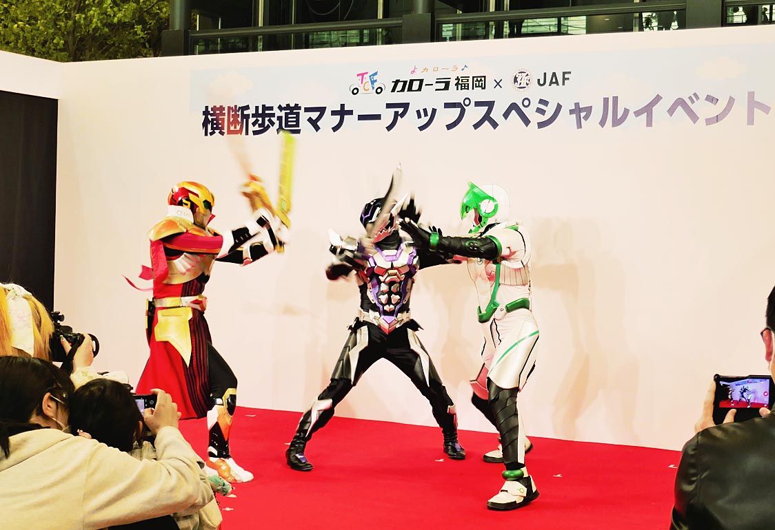 〝みんなで作ろう!歩行者が安心して横断歩道を渡れる福岡のまち〟と題して、トヨタカローラ福岡(金子護社長)とJAF福岡支部(内野伸一支部長)は9日、福岡市中央区の商業施設で「横断歩道マナーアップスペシャルイベント」を開催した。福岡発の特撮ヒ...