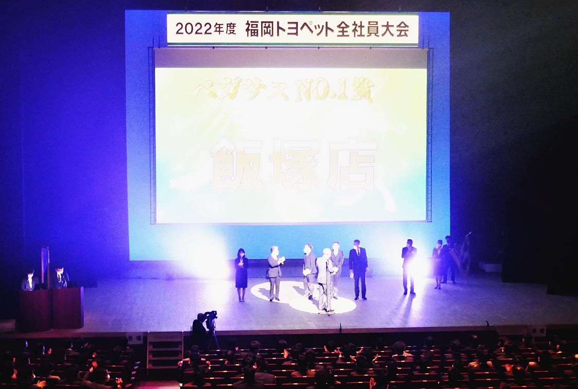 福岡トヨペット(村井隆介社長)は4日、久留米市内のイベントホールで「2022年度全社員大会」を開いた。年間表彰の受賞者らを除く社員はリモートで参加した。大会では昨年度の取り組みを振り返るとともに、今年度方針について説明。表彰式は各部門で優...