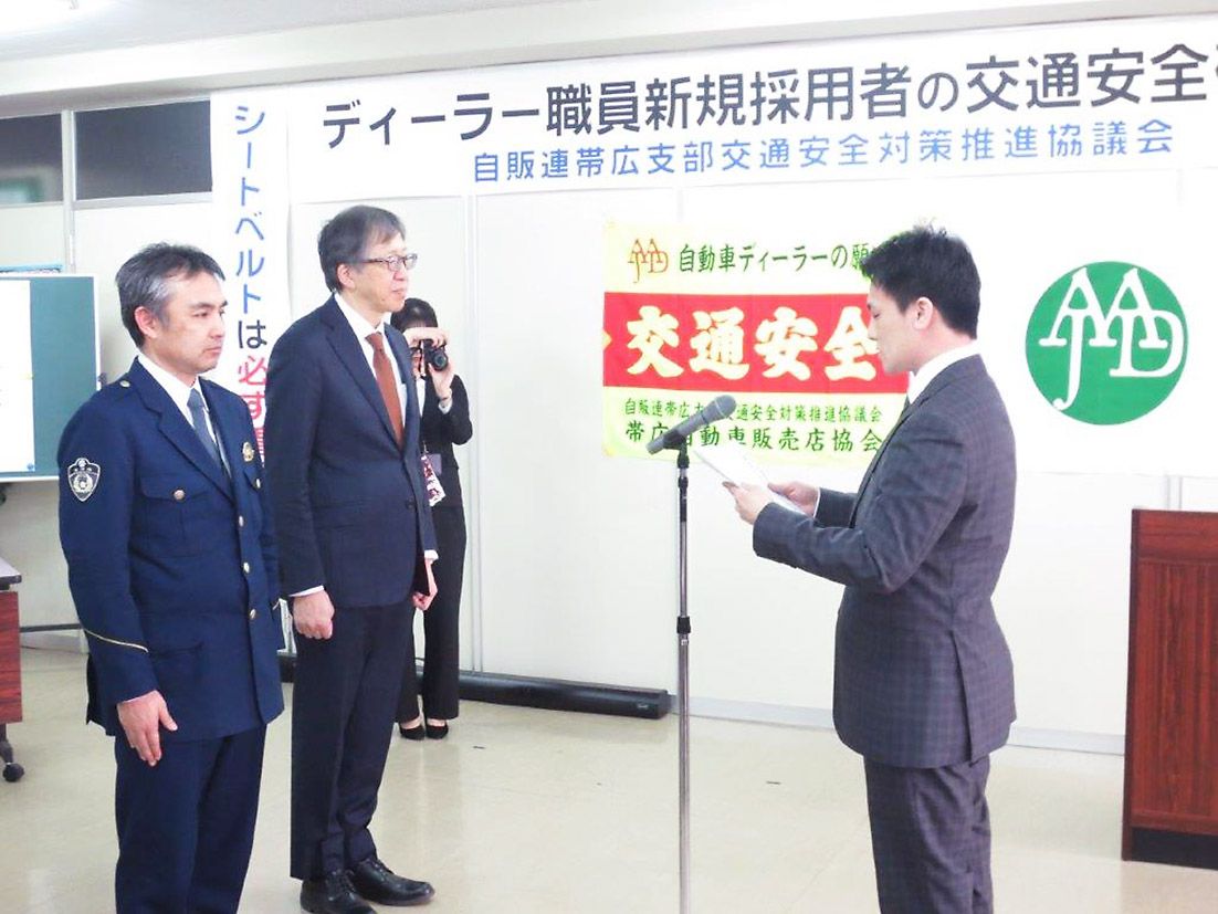 自販連帯広支部交通安全対策推進協議会(若林剛会長)は4月12日、「ディーラー職員新規採用者交通安全研修会」を帯広自動車販売店協会会館で開いた。会員ディーラー11社から今春に入社した新人32人が参加し、交通安全への取り組みを誓った。研修会の冒...