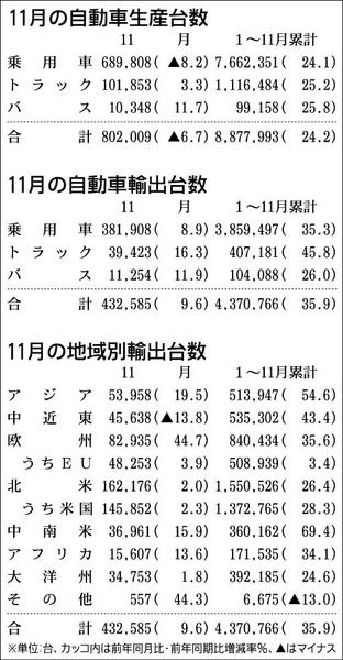 日本自動車工業会(自工会、志賀俊之会長)は27日、11月の生産・輸出実績を発表した。国内生産は前年同月比6・7%減の80万2009台となり、2カ月連続のマイナス。1~11月では前年同期比24・2%増の887万7993台とプラス基調を維持し...