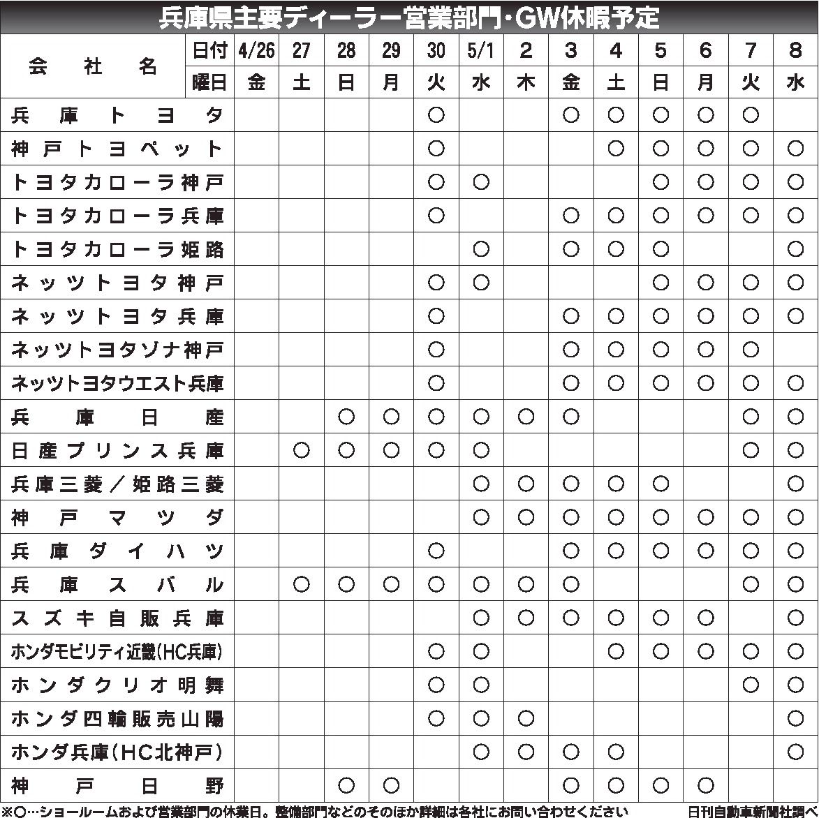 〈兵庫県主要ディーラー営業部門・GW休暇予定〉