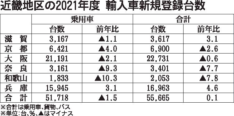 日本自動車輸入組合(JAIA)の発表によると、2021年度(4月~22年3月)の近畿地区の輸入車新規登録台数(外国メーカー車と日本メーカー車)は、前年度比0・1%増の5万5665台で、3年ぶりに前年台数を上回った。 4~8月が比較的好調だ...
