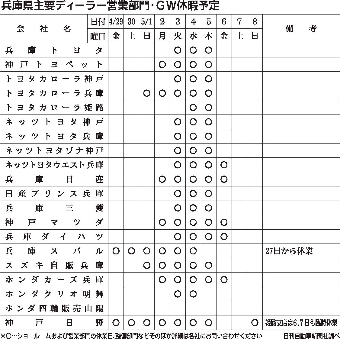 〈兵庫県主要ディーラー営業部門・GW休暇予定〉2022/4/29~5/8