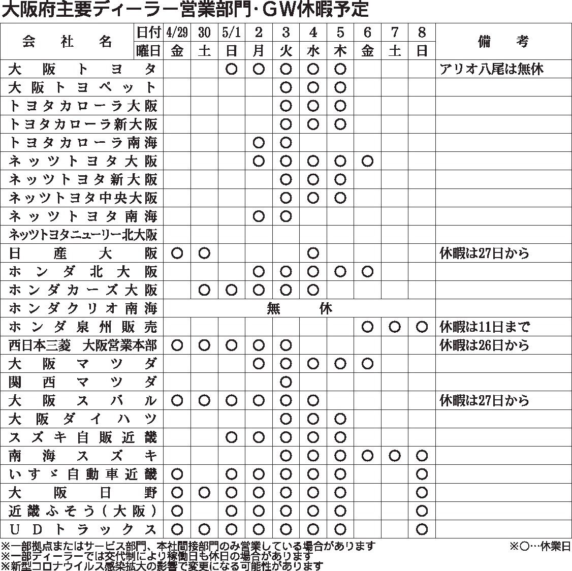 〈大阪府主要ディーラー営業部門・GW休暇予定〉2022/4/29~5/8