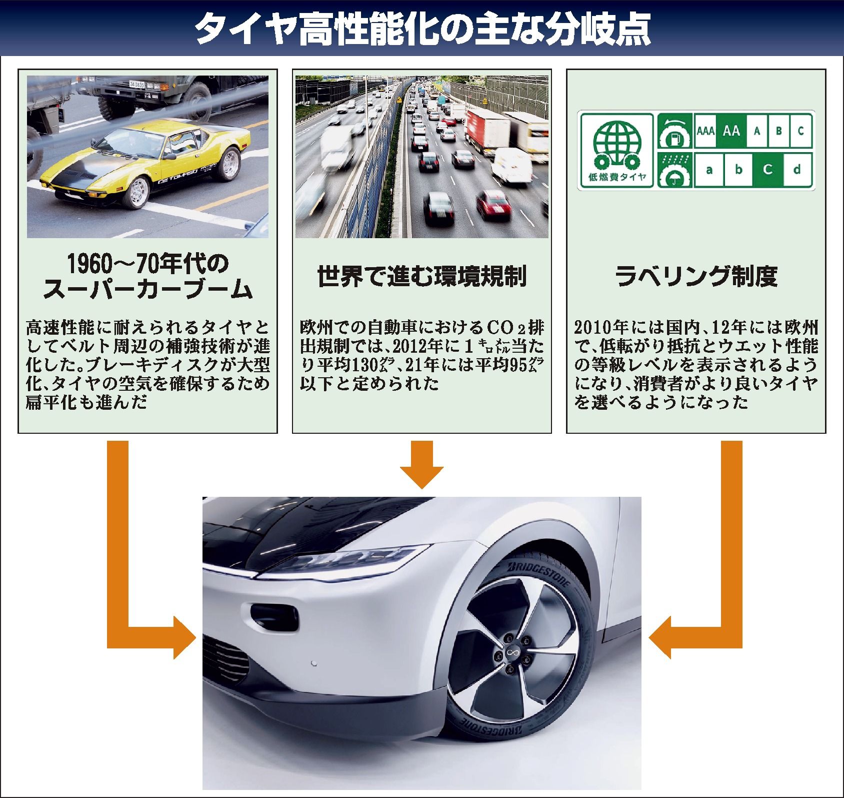 重量が1㌧以上ある乗用車を、1本当たりハガキ1枚分の面積で支えているタイヤ。自動車の基本性能である「走る・曲がる・止まる」を高度化するには、タイヤの性能に大きく左右される。自動車の発明とともに登場して以来、見た目は「ブラック」で地味なまま...