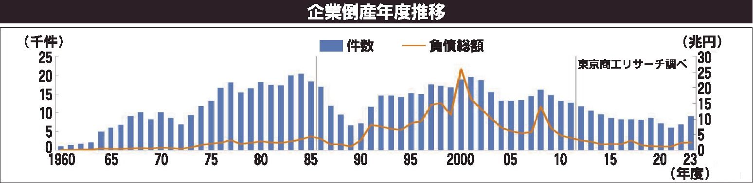 東京商工リサーチ(河原光雄社長、東京都千代田区)は、2023年度「全国企業倒産状況」をまとめた。負債額1千万円以上の企業倒産は9年ぶりに9千件台に達し、2年連続で前年度を上回った。負債総額も2年連続で前年度を上回り、2兆円超えも2年連続と...