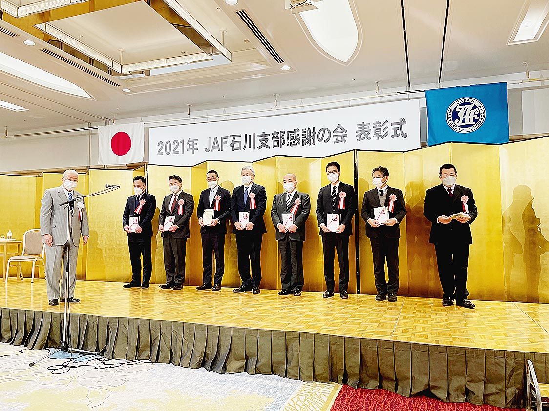【金沢】日本自動車連盟(JAF)石川支部(要明英二支部長)はこのほど、2021年の1年間、JAF会員の新規入会などに特に功績のあったディーラーやサービス事業者、および所属社員を表彰する「感謝の会」を、金沢市内のホテルで開催した=写真。 冒...